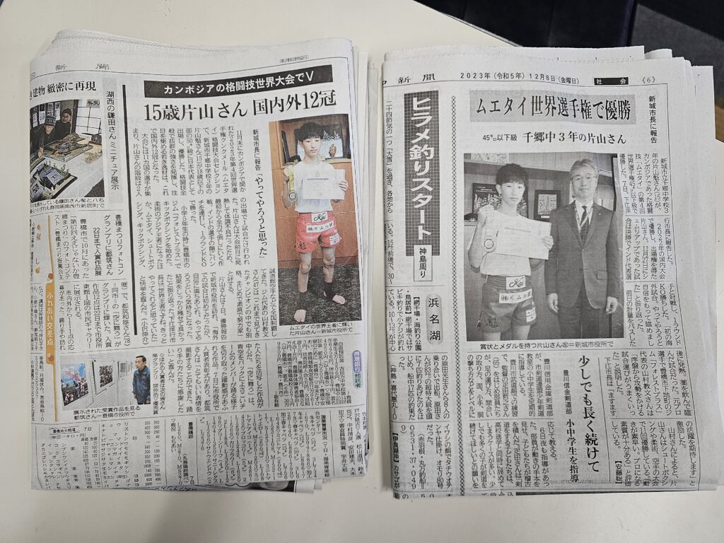 本日の朝刊にて先月11月27日にカンボジアにてアジアオリンピック委員会が開催した第4回ムエタイ(クンクメール)世界トーナメントにフォレストプラスから日本代表として出場した片山 魁(15歳)が世界王者に輝いた記事を